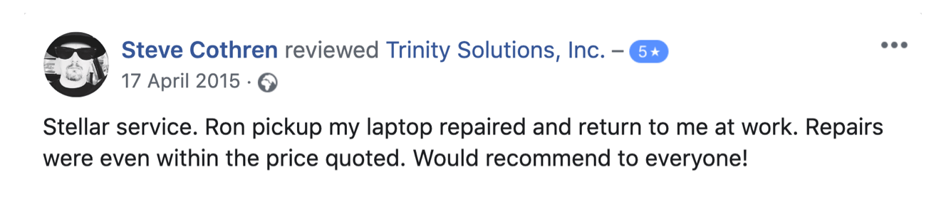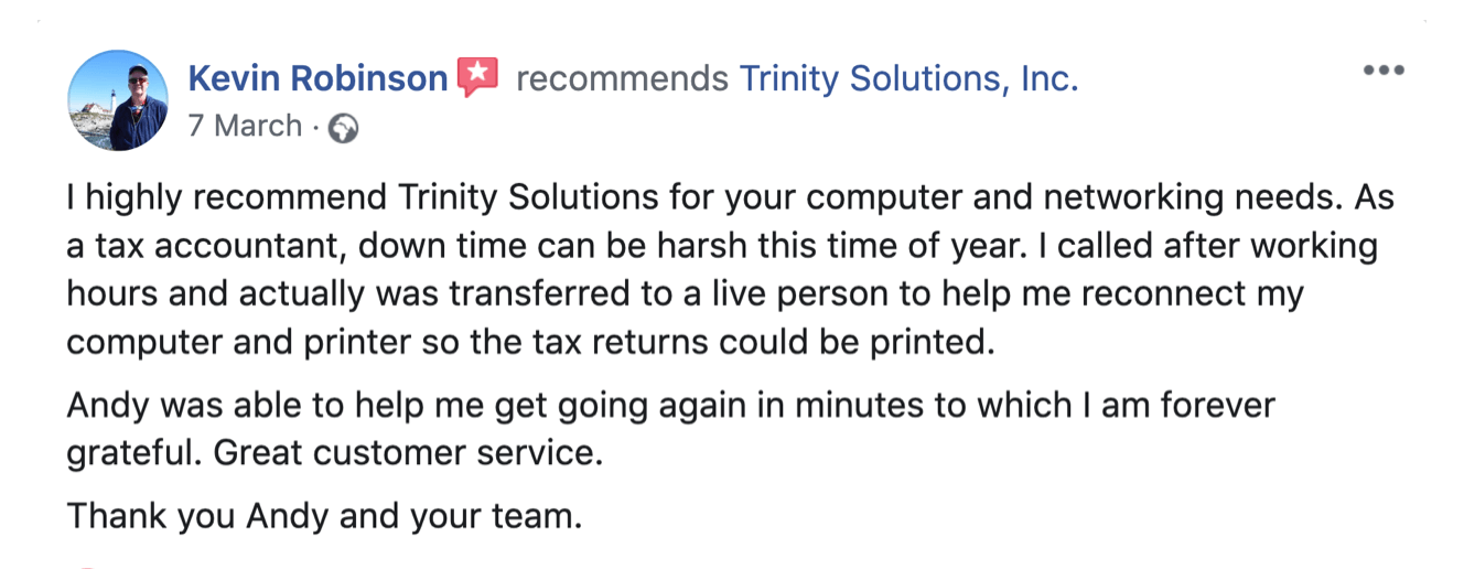 So, let us prove to you our value, just like we have for 200+ satisfied businesses. Experience REAL Managed IT service and support by switching to Trinity Solutions. We ARE what your company has been looking for. "Proving it" is what we do.